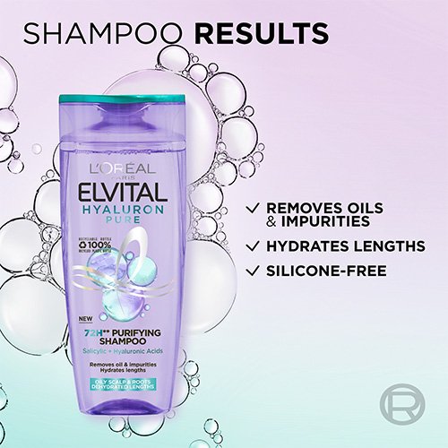 L'Oréal Paris Elvital Hyaluron Pure shampoo är för dig med oljig hårbotten och torra längder. Rengör håret från smuts och svett utan att rubba den naturliga oljebalsansen.