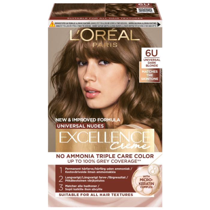 L'Oréal Paris Excellence Universal Nudes är en ammoniakfri semi-permanent hårfärg för alla hårtyper. Formulan passar alla hudtoner, tillför näring och glans** samt täcker grått hår upp till 100%*.