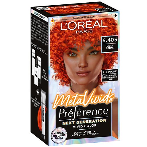 Préférence Metavivids är en praktisk 2-stegsrutin som kombinerar blekning och hårfärg i ett och samma kit. Blonderingen lyfter upp till 9 steg och den direktverkande färgen ger ett strålande, superintensivt slutresultat.